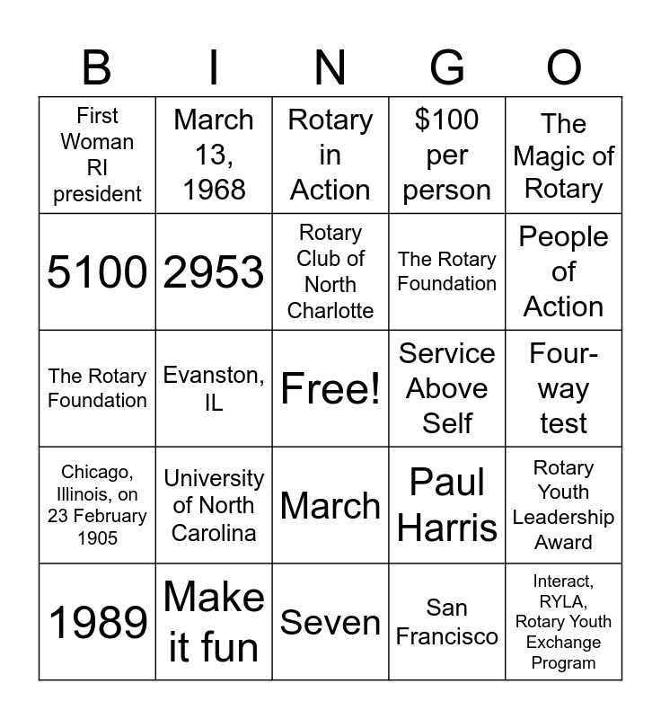 This bingo card has a free space and 27 words: Paul Harris, 1985, The Rotary Foundation, Seven, 5100, Rotary in Action, March 13, 1968, Chicago, Illinois, on 23 February 1905, Service Above Self, Rotary Youth Leadership Award, The Rotary Foundation, $100 per person, 1989, Make it fun, People of Action, 1.4 million, 2953, Rotary Club of North Charlotte, University of North Carolina, First Woman RI president, Four-way test, San Francisco, Evanston, IL, Interact, RYLA, Rotary Youth Exchange Program, March, The Magic of Rotary and Unite For Good.