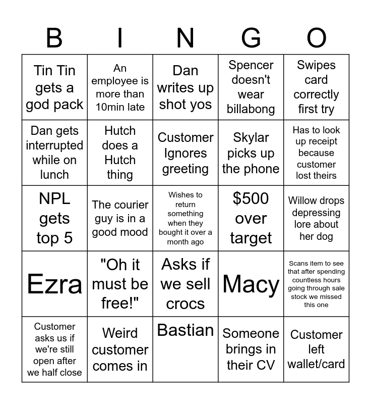 This bingo card has a free space and 24 words: "Oh it must be free!", Weird customer comes in, Customer Ignores greeting, Customer asks us if we're still open after we half close, Swipes card correctly first try, Tin Tin gets a god pack, Dan gets interrupted while on lunch, An employee is more than 10min late, $500 over target, Asks if we sell crocs, Skylar picks up the phone, NPL gets top 5, Macy, Scans item to see that after spending countless hours going through sale stock we missed this one, Hutch does a Hutch thing, Someone brings in their CV, Willow drops depressing lore about her dog, Dan writes up shot yos, Has to look up receipt because customer lost theirs, The courier guy is in a good mood, Customer left wallet/card, Ezra, Spencer doesn't wear billabong and Bastian.