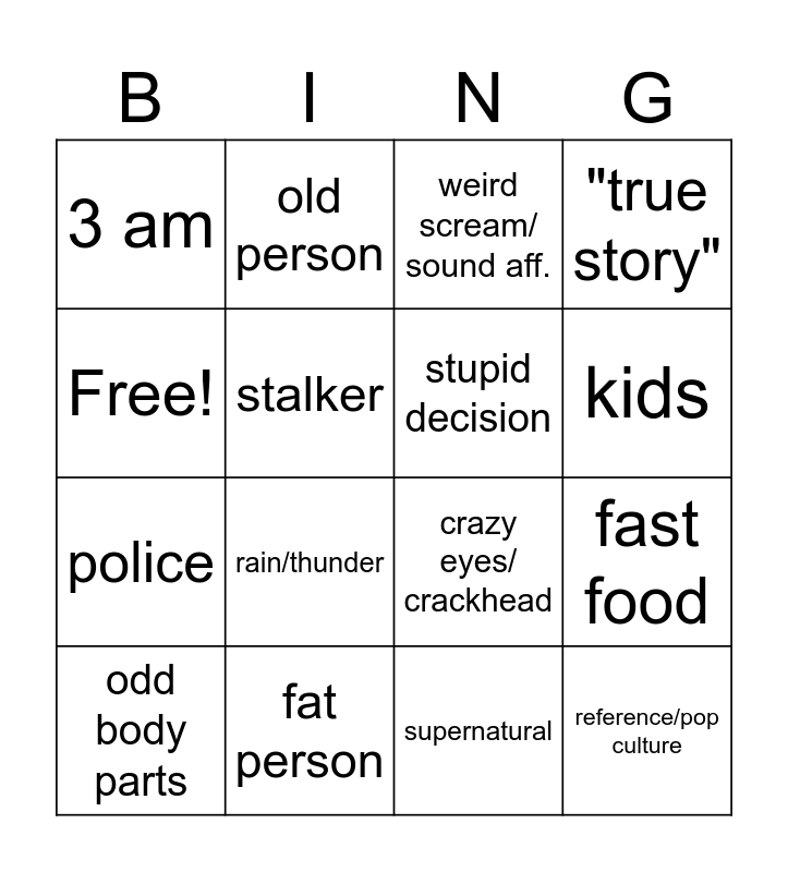 This bingo card has 16 words: fat person, fast food, weird scream/ sound aff., 3 am, police, old person, crazy eyes/ crackhead, supernatural, Free!, stalker, odd body parts, "true story", rain/thunder, kids, stupid decision and reference/pop culture.