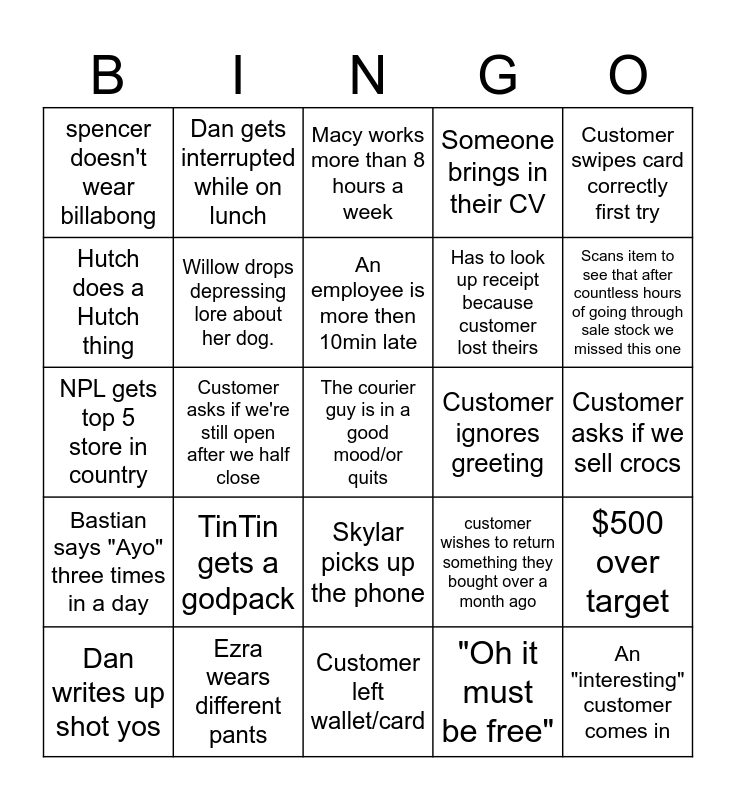 This bingo card has a free space and 24 words: TinTin gets a godpack, Ezra wears different pants, An employee is more then 10min late, Dan writes up shot yos, Customer swipes card correctly first try, spencer doesn't wear billabong, Hutch does a Hutch thing, Dan gets interrupted while on lunch, Customer ignores greeting, Skylar picks up the phone, Has to look up receipt because customer lost theirs, NPL gets top 5 store in country, customer wishes to return something they bought over a month ago, $500 over target, Willow drops depressing lore about her dog., "Oh it must be free", Customer asks if we sell crocs, Macy works more than 8 hours a week, Scans item to see that after countless hours of going through sale stock we missed this one, Customer asks if we're still open after we half close, An "interesting" customer comes in, Bastian says "Ayo" three times in a day, Someone brings in their CV and Customer left wallet/card.