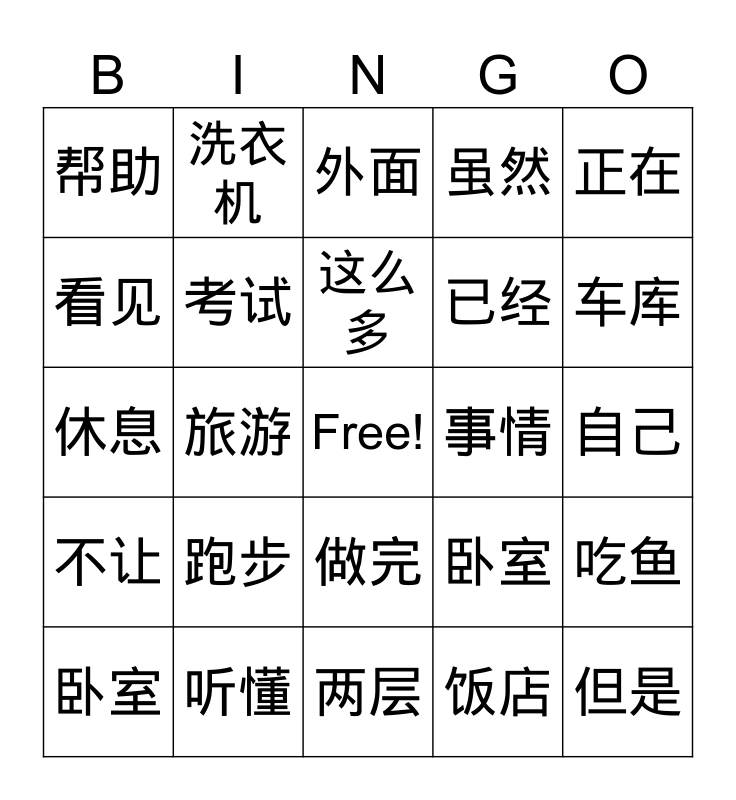 This bingo card has a free space and 40 words: 别看, 休息, 吃药, 考试, 听懂, 做完, 这么多, 准备, 正在, 不让, 旅游, 虽然, 但是, 自己, 事情, 跑步, 新衣服, 帮助, 希望, 外面, 吃鱼, 饭店, 已经, 看见, 自行车, 以前, 以后, 前面, 后面, 家具, 房间, 卧室, 洗手间, 卧室, 车库, 两层, 厨房, 电视, 洗衣机 and 冰箱.