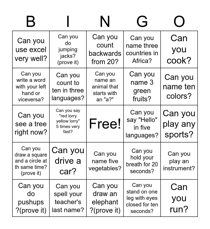 This bingo card has a free space and 24 words: Can you drive a car?, Can you spell your teacher's last name?, Can you name an animal that starts with an "a?", Can you do pushups ?(prove it), Can you cook?, Can you use excel very well?, Can you write a word with your left hand or viceversa?, Can you do jumping jacks? (prove it), Can you say "Hello" in five languages?, Can you name five vegetables?, Can you name 3 green fruits?, Can you see a tree right now?, Can you hold your breath for 20 seconds?, Can you play an instrument?, Can you count to ten in three languages?, Can you stand on one leg with eyes closed for ten seconds?, Can you play any sports?, Can you count backwards from 20?, Can you name ten colors?, Can you say "red lorry yellow lorry" 5 times very fast?, Can you run?, Can you draw a square and a circle at th same time? (prove it), Can you name three countries in Africa? and Can you draw an elephant ?(prove it).
