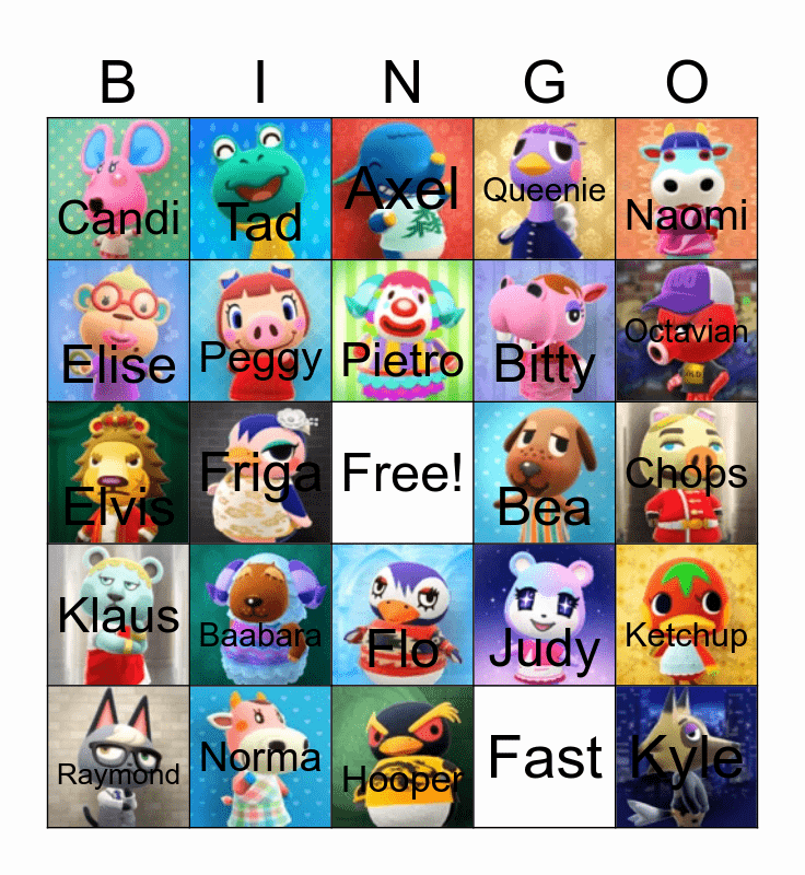 This bingo card has 24 images, a free space and 25 words: Baabara, Hooper, Pietro, Raymond, Naomi, Candi, Elise, Tad, Bea, Flo, Bitty, Elvis, Judy, Ketchup, Peggy, Al, Chops, Axel, Octavian, Friga, Kyle, Norma, Klaus, Queenie and Fast.