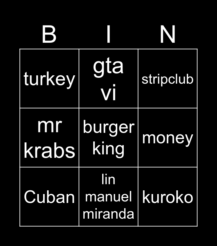 This bingo card has a free space and 8 words: money, stripclub, gta vi, Cuban, turkey, kuroko, mr krabs and lin manuel miranda.