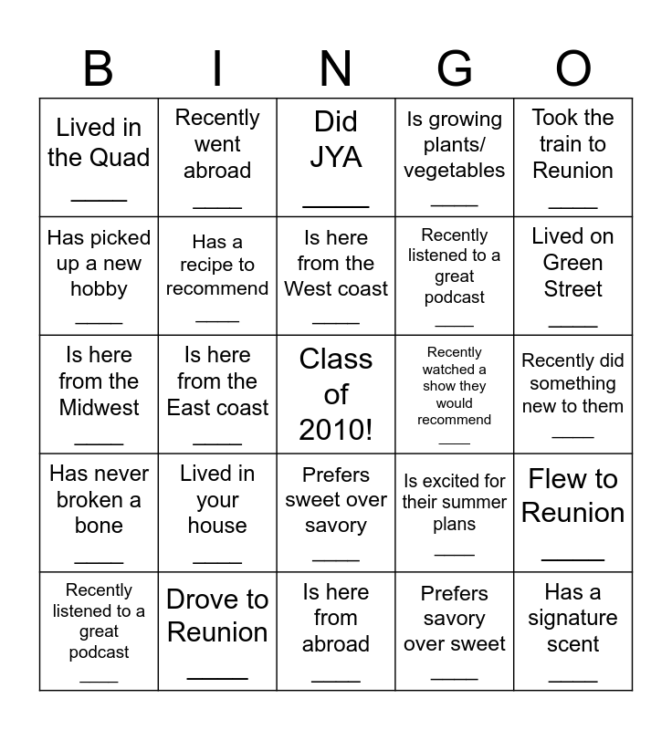 This bingo card has a free space and 24 words: Lived in your house ____, Drove to Reunion ____, Is here from the West coast ____, Recently listened to a great podcast ____, Took the train to Reunion ____, Lived in the Quad ____, Has picked up a new hobby ____, Recently went abroad ____, Recently watched a show they would recommend ____, Prefers sweet over savory ____, Recently listened to a great podcast ____, Is here from the Midwest ____, Is excited for their summer plans ____, Flew to Reunion ____, Has a recipe to recommend ____, Prefers savory over sweet ____, Recently did something new to them ____, Did JYA ____, Lived on Green Street ____, Is here from the East coast ____, Has a signature scent ____, Has never broken a bone ____, Is growing plants/ vegetables ____ and Is here from abroad ____.