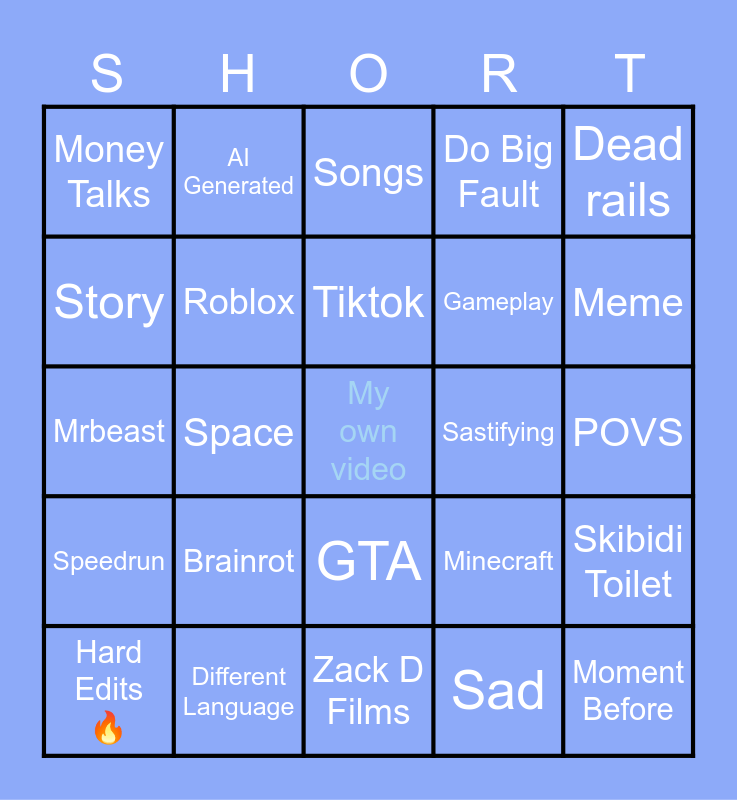 This bingo card has a free space and 24 words: Brainrot, Different Language, Tiktok, Hard Edits 🔥, Dead rails, Money Talks, Story, AI Generated, Sastifying, GTA, Gameplay, Mrbeast, Minecraft, Skibidi Toilet, Roblox, Sad, POVS, Songs, Meme, Space, Moment Before, Speedrun, Do Big Fault and Zack D Films.