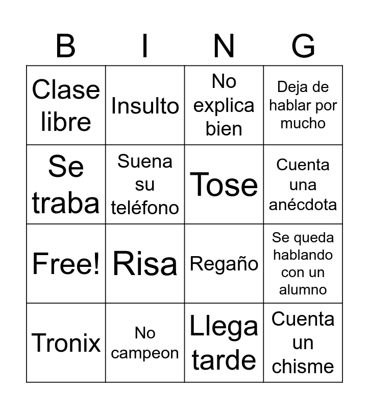 This bingo card has 20 words: Tronix, Camina por el salon, No explica bien, Se queda hablando con un alumno, No llega, Risa, Llega tarde, Deja de hablar por mucho, Free!, Insulto, Regaño, Cuenta una anécdota, Clase libre, No campeon, Tose, Se queda hablando con un maestro, Se traba, Suena su teléfono, Mira su celular and Cuenta un chisme.
