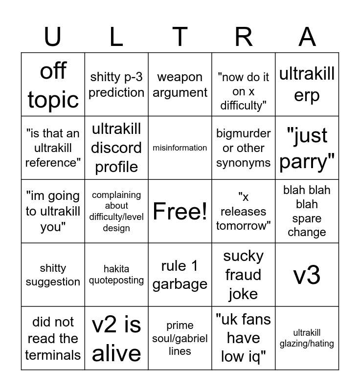 This bingo card has a free space and 24 words: did not read the terminals, hakita quoteposting, misinformation, "uk fans have low iq", ultrakill erp, off topic, shitty p-3 prediction, weapon argument, "x releases tomorrow", blah blah blah spare change, "im going to ultrakill you", ultrakill discord profile, sucky fraud joke, v3, "is that an ultrakill reference", v2 is alive, prime soul/gabriel lines, "now do it on x difficulty", "just parry", shitty suggestion, complaining about difficulty/level design, rule 1 garbage, bigmurder or other synonyms and ultrakill glazing/hating.