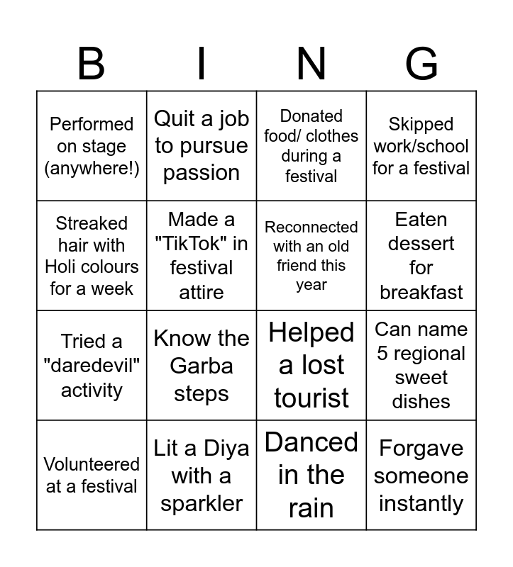 This bingo card has 16 words: Lit a Diya with a sparkler, Can name 5 regional sweet dishes, Donated food/ clothes during a festival, Performed on stage (anywhere!), Tried a "daredevil" activity, Quit a job to pursue passion, Helped a lost tourist, Danced in the rain, Streaked hair with Holi colours for a week, Made a "TikTok" in festival attire, Volunteered at a festival, Skipped work/school for a festival, Know the Garba steps, Eaten dessert for breakfast, Reconnected with an old friend this year and Forgave someone instantly.