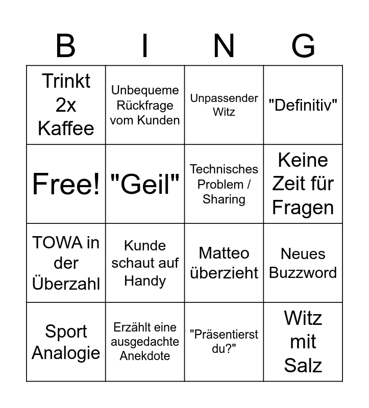 This bingo card has 16 words: Erzählt eine ausgedachte Anekdote, Neues Buzzword, Unpassender Witz, Trinkt 2x Kaffee, TOWA in der Überzahl, Unbequeme Rückfrage vom Kunden, Matteo überzieht, "Präsentierst du?", Free!, "Geil", Sport Analogie, "Definitiv", Kunde schaut auf Handy, Keine Zeit für Fragen, Technisches Problem / Sharing and Witz mit Salz.