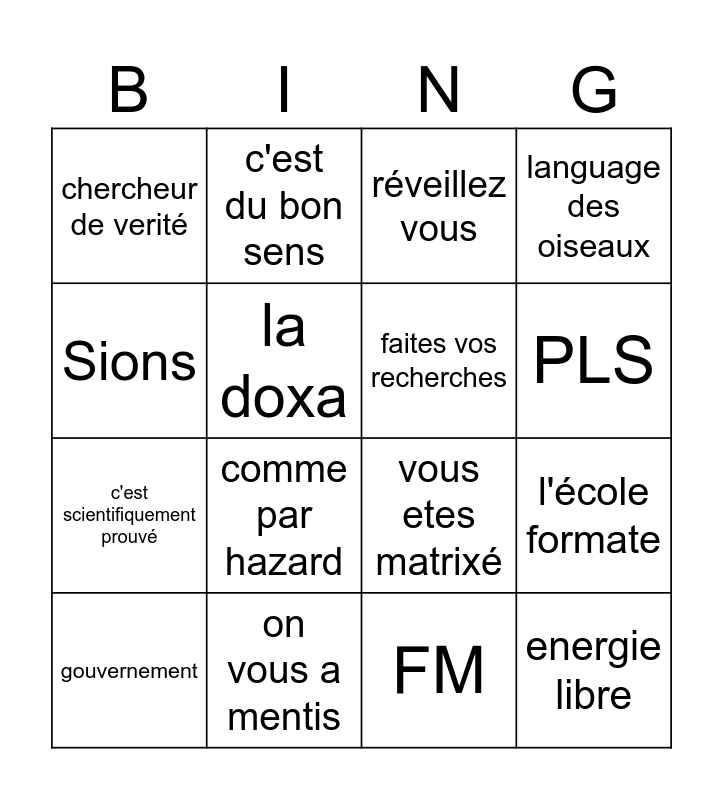 This bingo card has 16 words: on vous a mentis, l'école formate, réveillez vous, chercheur de verité, c'est scientifiquement prouvé, c'est du bon sens, vous etes matrixé, FM, Sions, la doxa, gouvernement, language des oiseaux, comme par hazard, PLS, faites vos recherches and energie libre.