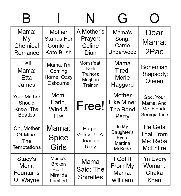 This bingo card has a free space and 55 words: Mr. Mom: Lonestar, Stacy's Mom: Fountains Of Wayne, Mamma Mia: ABBA, Mama: My Chemical Romance, Mama Said: The Shirelles, Mama, I'm a Big Girl Now: Maddie Baillio, Mama, I'm Coming Home: Ozzy Osbourne, Mama's Gun: Glass Animals, Mama Tired: Merle Haggard, Hey Mama: David Guetta, Mama's Song: Carrie Underwood, Mama's Boy: Dominic Fike, Mammas Don't Let Your Babies Grow up to Be Cowboys: Waylon Jennings, A Song For Mama: Boyz II Men, Shut up My Moms Calling: Hotel Ugly, Call Your Mom: Noah Kahan, Dear Mama: 2Pac, Mom: Earth, Wind & Fire, Isn't She Lovely: Stevie Wonder, I'm Every Woman: Chaka Khan, Mother Like Mine: The Band Perry, Mother: Sugarland, In My Daughter's Eyes: Martina McBride, A Mother's Prayer: Celine Dion, The Sweetest Gift: The Judds, Mom (feat. Kelli Trainor): Meghan Trainor, I Got It From My Mama: will.i.am, I Hope You Dance: Lee Ann Womack, God, Your Mama, And Me: Florida Georgia Line, He Gets That From Me: Reba McEntire, That's What Mamas Do: Jason Mattews, Mother's Daughter: Miley Cyrus, Motherlover: The Lonely Island, Mama Says: The Beach Boys, Tell Mama: Etta James, Your Mother Should Know: The Beatles, Mother's Little Helper: The Rolling Stones, Oh, Mother Of Mine: The Temptations, Grandmother: Finom, Blue: Beyonce, Mother Stands For Comfort: Kate Bush, Homeward Bound: Simon & Garfunkel, Volvo Driving Soccer Mom: Everclear, Mama Can't Buy You Love: Elton John, Mama: Spice Girls, Mama's Broken Heart: Miranda Lambert, Mama Told Me: Three Dog Night, Your Mama Don't Dance: Loggins & Messina, Ain't Your Mama: Jennifer Lopez, Bohemian Rhapsody: Queen, On My Mama: Victoria Monet, I Called Mama: Tim McGraw, Hey Ma: Chance The Rapper, Harper Valley P.T.A: Jeannie Riley and Cleanin Out My Closet: Eminem.