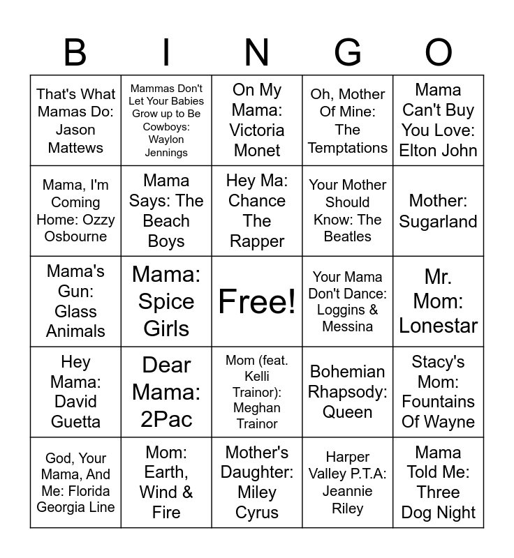 This bingo card has a free space and 55 words: I Hope You Dance: Lee Ann Womack, God, Your Mama, And Me: Florida Georgia Line, He Gets That From Me: Reba McEntire, That's What Mamas Do: Jason Mattews, Mother's Daughter: Miley Cyrus, Motherlover: The Lonely Island, Mama Says: The Beach Boys, Tell Mama: Etta James, Your Mother Should Know: The Beatles, Mother's Little Helper: The Rolling Stones, Oh, Mother Of Mine: The Temptations, Grandmother: Finom, Blue: Beyonce, Mother Stands For Comfort: Kate Bush, Homeward Bound: Simon & Garfunkel, Volvo Driving Soccer Mom: Everclear, Mama Can't Buy You Love: Elton John, Mama: Spice Girls, Mama's Broken Heart: Miranda Lambert, Mama Told Me: Three Dog Night, Your Mama Don't Dance: Loggins & Messina, Ain't Your Mama: Jennifer Lopez, Bohemian Rhapsody: Queen, On My Mama: Victoria Monet, I Called Mama: Tim McGraw, Hey Ma: Chance The Rapper, Harper Valley P.T.A: Jeannie Riley, Cleanin Out My Closet: Eminem, Mr. Mom: Lonestar, Stacy's Mom: Fountains Of Wayne, Mamma Mia: ABBA, Mama: My Chemical Romance, Mama Said: The Shirelles, Mama, I'm a Big Girl Now: Maddie Baillio, Mama, I'm Coming Home: Ozzy Osbourne, Mama's Gun: Glass Animals, Mama Tired: Merle Haggard, Hey Mama: David Guetta, Mama's Song: Carrie Underwood, Mama's Boy: Dominic Fike, Mammas Don't Let Your Babies Grow up to Be Cowboys: Waylon Jennings, A Song For Mama: Boyz II Men, Shut up My Moms Calling: Hotel Ugly, Call Your Mom: Noah Kahan, Dear Mama: 2Pac, Mom: Earth, Wind & Fire, Isn't She Lovely: Stevie Wonder, I'm Every Woman: Chaka Khan, Mother Like Mine: The Band Perry, Mother: Sugarland, In My Daughter's Eyes: Martina McBride, A Mother's Prayer: Celine Dion, The Sweetest Gift: The Judds, Mom (feat. Kelli Trainor): Meghan Trainor and I Got It From My Mama: will.i.am.