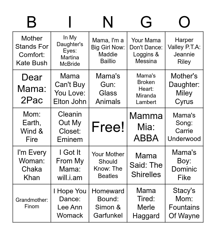This bingo card has a free space and 55 words: Oh, Mother Of Mine: The Temptations, Grandmother: Finom, Blue: Beyonce, Mother Stands For Comfort: Kate Bush, Homeward Bound: Simon & Garfunkel, Volvo Driving Soccer Mom: Everclear, Mama Can't Buy You Love: Elton John, Mama: Spice Girls, Mama's Broken Heart: Miranda Lambert, Mama Told Me: Three Dog Night, Your Mama Don't Dance: Loggins & Messina, Ain't Your Mama: Jennifer Lopez, Bohemian Rhapsody: Queen, On My Mama: Victoria Monet, I Called Mama: Tim McGraw, Hey Ma: Chance The Rapper, Harper Valley P.T.A: Jeannie Riley, Cleanin Out My Closet: Eminem, Mr. Mom: Lonestar, Stacy's Mom: Fountains Of Wayne, Mamma Mia: ABBA, Mama: My Chemical Romance, Mama Said: The Shirelles, Mama, I'm a Big Girl Now: Maddie Baillio, Mama, I'm Coming Home: Ozzy Osbourne, Mama's Gun: Glass Animals, Mama Tired: Merle Haggard, Hey Mama: David Guetta, Mama's Song: Carrie Underwood, Mama's Boy: Dominic Fike, Mammas Don't Let Your Babies Grow up to Be Cowboys: Waylon Jennings, A Song For Mama: Boyz II Men, Shut up My Moms Calling: Hotel Ugly, Call Your Mom: Noah Kahan, Dear Mama: 2Pac, Mom: Earth, Wind & Fire, Isn't She Lovely: Stevie Wonder, I'm Every Woman: Chaka Khan, Mother Like Mine: The Band Perry, Mother: Sugarland, In My Daughter's Eyes: Martina McBride, A Mother's Prayer: Celine Dion, The Sweetest Gift: The Judds, Mom (feat. Kelli Trainor): Meghan Trainor, I Got It From My Mama: will.i.am, I Hope You Dance: Lee Ann Womack, God, Your Mama, And Me: Florida Georgia Line, He Gets That From Me: Reba McEntire, That's What Mamas Do: Jason Mattews, Mother's Daughter: Miley Cyrus, Motherlover: The Lonely Island, Mama Says: The Beach Boys, Tell Mama: Etta James, Your Mother Should Know: The Beatles and Mother's Little Helper: The Rolling Stones.