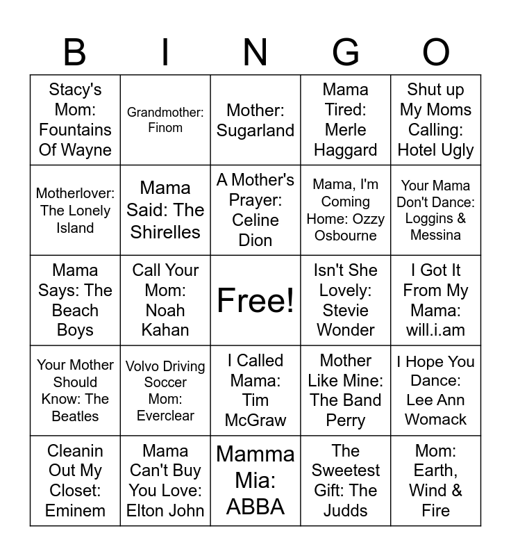This bingo card has a free space and 55 words: Harper Valley P.T.A: Jeannie Riley, Cleanin Out My Closet: Eminem, Mr. Mom: Lonestar, Stacy's Mom: Fountains Of Wayne, Mamma Mia: ABBA, Mama: My Chemical Romance, Mama Said: The Shirelles, Mama, I'm a Big Girl Now: Maddie Baillio, Mama, I'm Coming Home: Ozzy Osbourne, Mama's Gun: Glass Animals, Mama Tired: Merle Haggard, Hey Mama: David Guetta, Mama's Song: Carrie Underwood, Mama's Boy: Dominic Fike, Mammas Don't Let Your Babies Grow up to Be Cowboys: Waylon Jennings, A Song For Mama: Boyz II Men, Shut up My Moms Calling: Hotel Ugly, Call Your Mom: Noah Kahan, Dear Mama: 2Pac, Mom: Earth, Wind & Fire, Isn't She Lovely: Stevie Wonder, I'm Every Woman: Chaka Khan, Mother Like Mine: The Band Perry, Mother: Sugarland, In My Daughter's Eyes: Martina McBride, A Mother's Prayer: Celine Dion, The Sweetest Gift: The Judds, Mom (feat. Kelli Trainor): Meghan Trainor, I Got It From My Mama: will.i.am, I Hope You Dance: Lee Ann Womack, God, Your Mama, And Me: Florida Georgia Line, He Gets That From Me: Reba McEntire, That's What Mamas Do: Jason Mattews, Mother's Daughter: Miley Cyrus, Motherlover: The Lonely Island, Mama Says: The Beach Boys, Tell Mama: Etta James, Your Mother Should Know: The Beatles, Mother's Little Helper: The Rolling Stones, Oh, Mother Of Mine: The Temptations, Grandmother: Finom, Blue: Beyonce, Mother Stands For Comfort: Kate Bush, Homeward Bound: Simon & Garfunkel, Volvo Driving Soccer Mom: Everclear, Mama Can't Buy You Love: Elton John, Mama: Spice Girls, Mama's Broken Heart: Miranda Lambert, Mama Told Me: Three Dog Night, Your Mama Don't Dance: Loggins & Messina, Ain't Your Mama: Jennifer Lopez, Bohemian Rhapsody: Queen, On My Mama: Victoria Monet, I Called Mama: Tim McGraw and Hey Ma: Chance The Rapper.