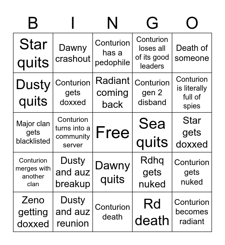 This bingo card has a free space and 24 words: Dusty and auz breakup, Dusty and auz reunion, Radiant coming back, Zeno getting doxxed, Death of someone, Star quits, Dusty quits, Dawny crashout, Sea quits, Dawny quits, Conturion gen 2 disband, Major clan gets blacklisted, Rdhq gets nuked, Conturion gets nuked, Conturion gets doxxed, Rd death, Star gets doxxed, Conturion has a pedophile, Conturion is literally full of spies, Conturion turns into a community server, Conturion becomes radiant, Conturion merges with another clan, Conturion loses all of its good leaders and Conturion death.