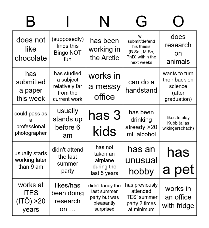 This bingo card has 35 words: Free!, has attended ITES' rDay 3 times at least, has done a research project in collaboration with another group within ITES, has studied a subject relatively far from the current work, has not taken an airplane during the last 5 years, will submit/defend his thesis (B.Sc., M.Sc, PhD) within the next weeks, has submitted a paper this week, has begun working at ITES this year, works in a messy office, has been riding a night train in their life, could pass as a professional photographer, does research on animals, prefers wine over beer, does not drink coffee, does not like chocolate, has been drinking already >20 mL alcohol, has previously attended ITES' summer party 2 times at minimum, usually stands up before 6 am, usually starts working later than 9 am, has 3 kids, has an unusual hobby, works at ITES (ITÖ) >20 years, has a pet, likes/has been doing research on …, has been working in the Arctic, wants to turn their back on science (after graduation), works in an office with fridge, does research on AI (not only using ChatGPT), can do a handstand, likes to play Kubb (alias wikingerschach), arrived later than 17:30 at this summer party, didn't fancy the last summer party but was pleasantly surprised, didn't attend the last summer party, (supposedly) finds this Bingo NOT fun and researches something that has nothing to do with terrestrial ecosystems.