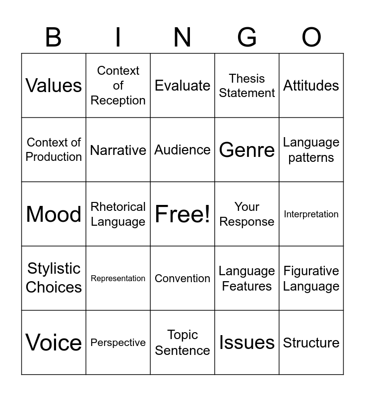This bingo card has a free space and 24 words: Representation, Perspective, Audience, Voice, Attitudes, Values, Context of Production, Context of Reception, Your Response, Convention, Genre, Mood, Language Features, Figurative Language, Narrative, Issues, Interpretation, Evaluate, Language patterns, Rhetorical Language, Structure, Stylistic Choices, Thesis Statement and Topic Sentence.