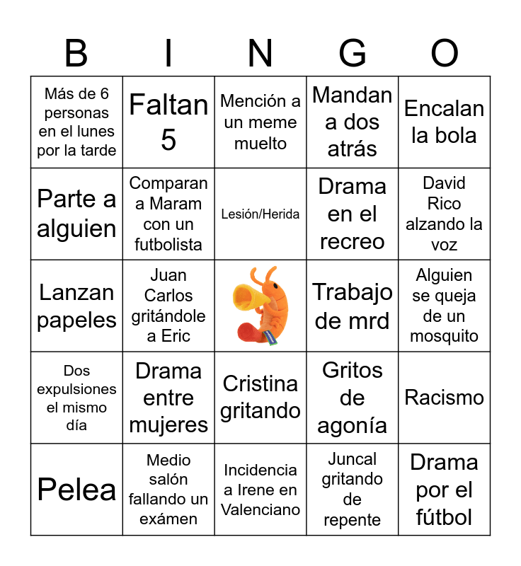 This bingo card has a free space and 24 words: Drama entre mujeres, Medio salón fallando un exámen, Lesión/Herida, Pelea, Encalan la bola, Más de 6 personas en el lunes por la tarde, Parte a alguien, Faltan 5, Trabajo de mrd, Cristina gritando, Drama en el recreo, Lanzan papeles, Gritos de agonía, Racismo, Comparan a Maram con un futbolista, Juncal gritando de repente, Alguien se queja de un mosquito, Mención a un meme muelto, David Rico alzando la voz, Juan Carlos gritándole a Eric, Drama por el fútbol, Dos expulsiones el mismo día, Mandan a dos atrás and Incidencia a Irene en Valenciano.