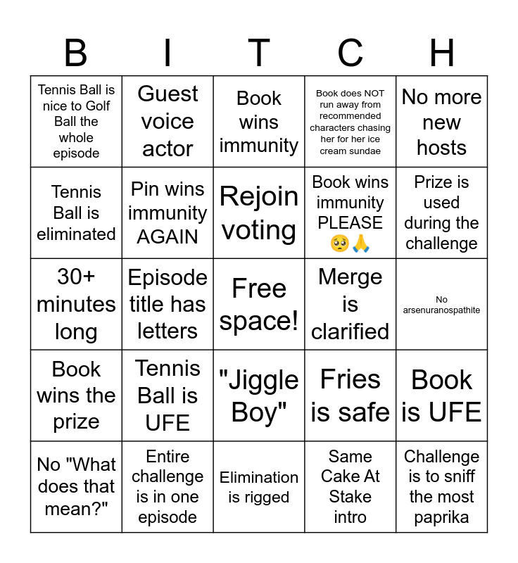This bingo card has a free space and 24 words: Tennis Ball is UFE, Entire challenge is in one episode, Rejoin voting, No "What does that mean?", No more new hosts, Tennis Ball is nice to Golf Ball the whole episode, Tennis Ball is eliminated, Guest voice actor, Merge is clarified, "Jiggle Boy", Book wins immunity PLEASE π₯Ίπ, 30+ minutes long, Fries is safe, Book is UFE, Pin wins immunity AGAIN, Same Cake At Stake intro, No arsenuranospathite, Book wins immunity, Prize is used during the challenge, Episode title has letters, Challenge is to sniff the most paprika, Book wins the prize, Book does NOT run away from recommended characters chasing her for her ice cream sundae and Elimination is rigged.