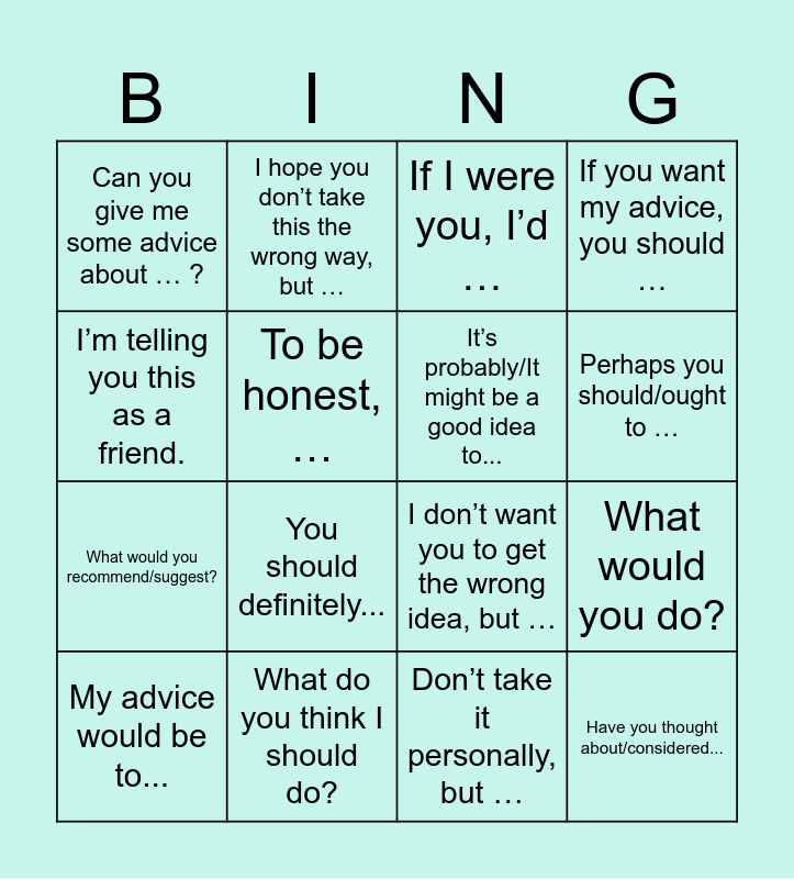 This bingo card has 16 words: What do you think I should do?, What would you do?, If I were you, I’d …, Can you give me some advice about … ?, What would you recommend/suggest?, I hope you don’t take this the wrong way, but …, I don’t want you to get the wrong idea, but …, Don’t take it personally, but …, I’m telling you this as a friend., To be honest, …, My advice would be to..., If you want my advice, you should …, You should definitely..., Perhaps you should/ought to …, It’s probably/It might be a good idea to... and Have you thought about/considered....
