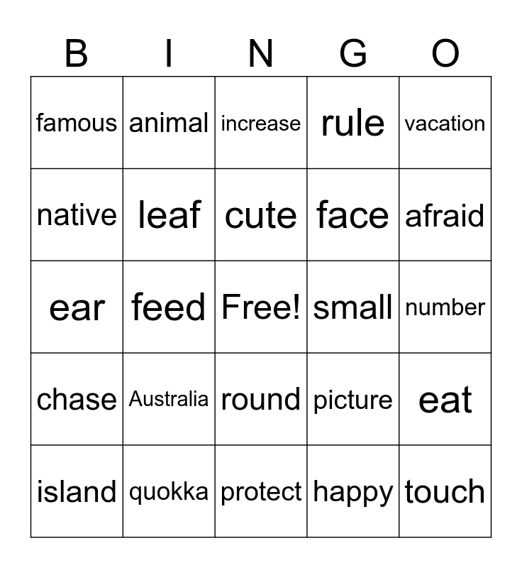 This bingo card has a free space and 24 words: Australia, quokka, cute, island, vacation, famous, native, animal, small, round, face, ear, picture, eat, leaf, happy, number, increase, afraid, feed, touch, chase, rule and protect.