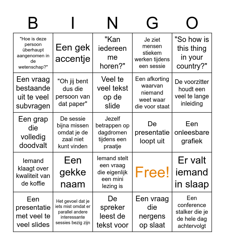 This bingo card has 25 words: Een gekke naam, De spreker leest de tekst voor, Veel te veel tekst op de slide, Een presentatie met veel te veel slides, "So how is this thing in your country?", "Hoe is deze persoon überhaupt aangenomen in de wetenschap?", Een vraag bestaande uit te veel subvragen, Een gek accentje, De presentatie loopt uit, Iemand stelt een vraag die eigenlijk een mini lezing is, Een afkorting waarvan niemand weet waar die voor staat, Een grap die volledig doodvalt, Free!, Er valt iemand in slaap, "Oh jij bent dus die persoon van dat paper", Een conference stalker die je de hele dag achtervolgt, Een onleesbare grafiek, "Kan iedereen me horen?", De voorzitter houdt een veel te lange inleiding, De sessie bijna missen omdat je de zaal niet kunt vinden, Jezelf betrappen op dagdromen tijdens een praatje, Het gevoel dat je iets mist omdat er parallel andere interessante sessies bezig zijn, Iemand klaagt over kwaliteit van de koffie, Je ziet mensen stiekem werken tijdens een sessie and Een vraag die nergens op slaat.