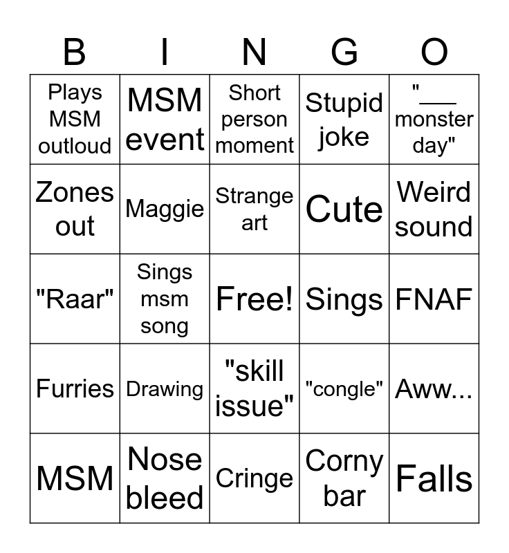 This bingo card has a free space and 29 words: MSM, Epic humbug, Sings msm song, Harmonica, Plays MSM outloud, Short person moment, Maggie, Drawing, Sings, Nose bleed, FNAF, Falls, Cringe, Corny bar, Weird sound, Falls asleep, "skill issue", Furries, "___ monster day", "Raar", "congle", Markiplier, Cute, Zones out, Stupid joke, MSM event, Aww..., Strange art and Gross.