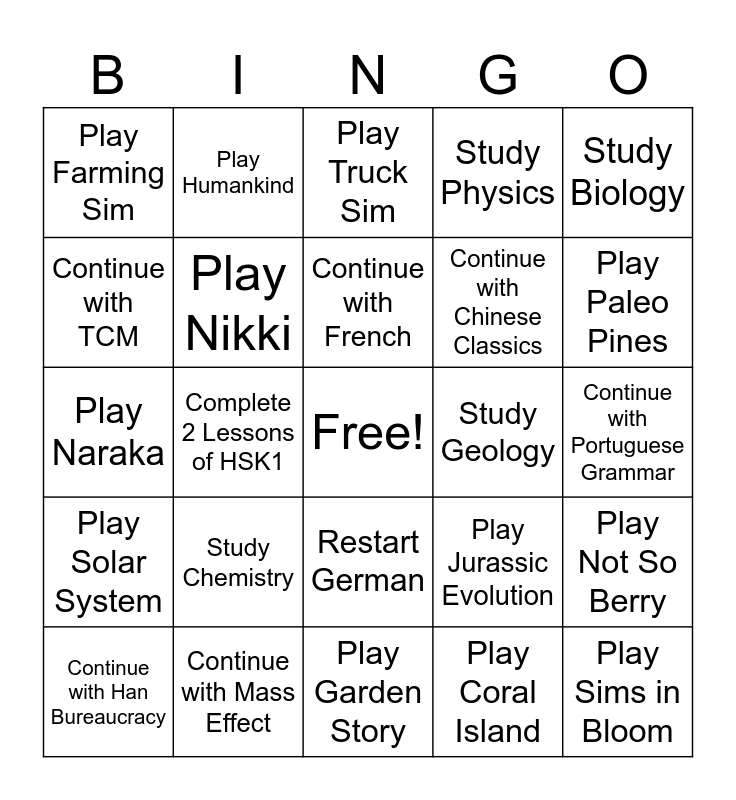 This bingo card has a free space and 24 words: Study Chemistry, Continue with Mass Effect, Continue with French, Continue with Han Bureaucracy, Study Biology, Play Farming Sim, Continue with TCM, Play Humankind, Study Geology, Restart German, Continue with Chinese Classics, Play Naraka, Play Jurassic Evolution, Play Not So Berry, Play Nikki, Play Coral Island, Continue with Portuguese Grammar, Play Truck Sim, Play Paleo Pines, Complete 2 Lessons of HSK1, Play Sims in Bloom, Play Solar System, Study Physics and Play Garden Story.