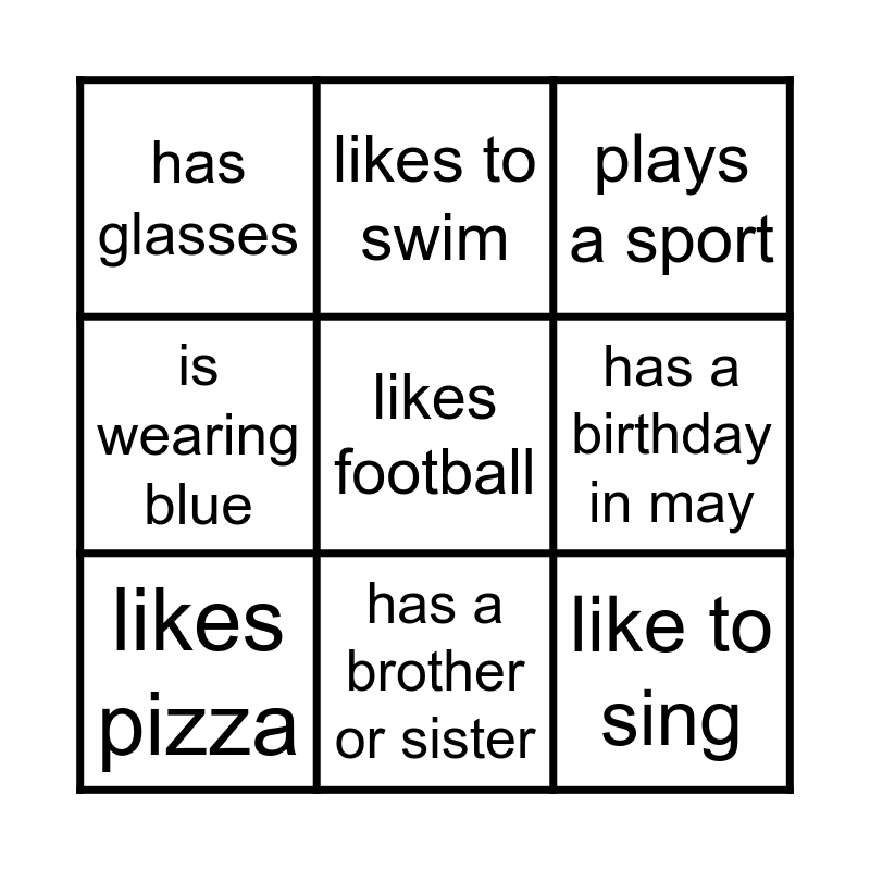 This bingo card has a free space and 11 words: has a dog, has a brother or sister, like to sing, likes pizza, likes to swim, plays a sport, has a birthday in may, likes to dance, is wearing blue, has glasses and walks to school.