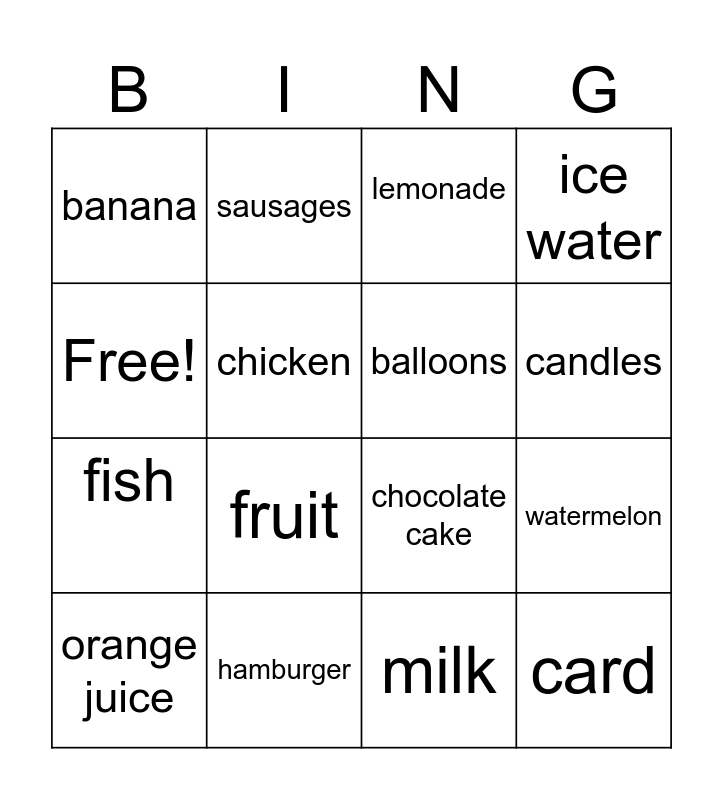 This bingo card has 16 words: hamburger, watermelon, lemonade, banana, fish, sausages, chocolate cake, milk, Free!, chicken, orange juice, ice water, fruit, candles, balloons and card.