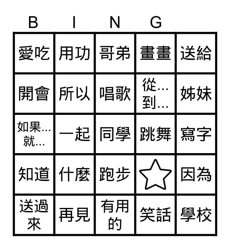 This bingo card has 1 images and 24 words: 什麼, 有用的, 唱歌, 送過來, 送給, 愛吃, 開會, 用功, 跳舞, 跑步, 從...到..., 如果...就..., 因為, 所以, 學校, 寫字, 哥弟, 姊妹, 一起, 同學, 再見, 知道, 畫畫 and 笑話.
