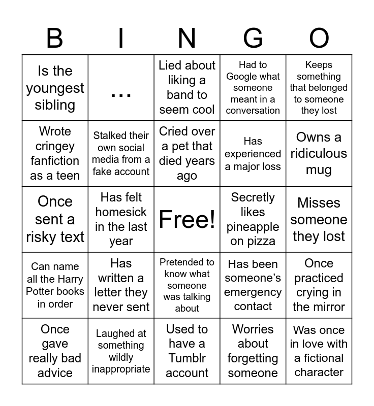 This bingo card has a free space and 129 words: ..., ..., ..., ..., ..., Has lived in another country, Can name all the Harry Potter books in order, Owns more than 3 plants, Has cried during a Disney movie, Has once forgotten their own birthday, Is afraid of birds, Speaks 3 or more languages, Once dyed their hair a bold color, Knows how to knit or crochet, Has attended a wedding this year, Has never broken a bone, Used to have a Tumblr account, Can whistle with fingers, Can do the Macarena from memory, Has fallen asleep during a lecture, Has had a broken heart, Has experienced a major loss, Wears mismatched socks on purpose, Has adopted a pet, Once wrote a poem about someone, Can name 5 Taylor Swift songs, Was once in love with a fictional character, Can touch their toes without bending their knees, Has been ghosted, Owns something from IKEA they never built, Once sent a risky text, Has felt homesick in the last year, Once laughed at a funeral (nervously counts), Has been in therapy, Has danced alone in the rain, Once kissed someone they shouldn't have, Has a playlist for crying, Can name 3 kinds of cheese, Has had a weird roommate, Has binged a whole series in one weekend, Secretly likes pineapple on pizza, Once fell in public and pretended it didn’t happen, Still sleeps with a stuffed animal, Knows the entire script of a movie by heart, Once went on a really bad date, Has cried on public transport, Thinks about death more often than they’d admit, Has written a letter they never sent, Regrets something they never said, Has been someone’s emergency contact, Has felt completely alone in a crowd, Once gave really bad advice, Lied and said they were "fine", Had a panic attack in a weird place, Stayed friends with an ex (or tried to), Hates their birthday, Loves their birthday, Finds comfort in routines, Misses someone they haven’t spoken to in years, Cares more than they show, Often comforts others but forgets themselves, Once left a party to cry in the bathroom, Would drop everything for a friend in need, Has trouble asking for help, Is the oldest sibling, Is the youngest sibling, Is an only child, Can cook a decent meal without a recipe, Owns a ridiculous mug, Wrote cringey fanfiction as a teen, Has read a book that changed their life, Misses someone they lost, Still talks to someone who passed away, Found strength they didn’t know they had, Held someone's hand through grief, Lost someone suddenly, Felt guilty after someone’s death, Had to be strong for others, Wrote a goodbye they never got to say, Grieved something before it was gone, Worries about forgetting someone, Keeps something that belonged to someone they lost, Still checks a loved one’s old social media, Heard someone's last words, Cried over a pet that died years ago, Said "I’m fine" when they were breaking inside, Laughed at something wildly inappropriate, Once dated someone with a weird name, Got dumped over text, Still checks an ex’s Instagram, Woke up somewhere they didn’t expect, Fell asleep during an important moment, Pretended to know what someone was talking about, Thought their mic was off (but it wasn’t), Started crying while watching a cooking video, Had an imaginary friend for too long, Tried to impress someone and failed, Lied about liking a band to seem cool, Stalked their own social media from a fake account, Got a weird injury from something very normal, Once made up a fake hobby for a dating profile, Had to Google what someone meant in a conversation, Forgot someone’s name mid-conversation, Blurted something out and immediately regretted it, Saved a weird voicemail just because, Once practiced crying in the mirror, Told someone they were okay just to avoid talking, Once peed from laughing too hard, Can make a weird noise with their body, Gave themselves a bad haircut (on purpose or not), Has cried at a party, Laughed so hard they started crying, Once danced and regretted it the next day, Can’t ride a bike (but won’t admit it), Has had an existential crisis over a potato, Sings in the shower like it’s a concert, Once had a dream so intense it changed their mood for the whole day, Still holds a grudge from 10 years ago, Owns a shirt with a stain but wears it anyway, Had a spiritual crisis in IKEA, Lost sleep over an imaginary argument, Got mad at someone in a dream and stayed mad in real life, Talked to themselves in public (and pretended it was Bluetooth), Used “I have a stomach ache” as an excuse for emotional distress, Thinks too much while brushing their teeth, Had an emotion they couldn’t name, Once fake-laughed for an hour straight, Felt emotionally attached to a song they didn’t understand and Started crying and didn’t know why.