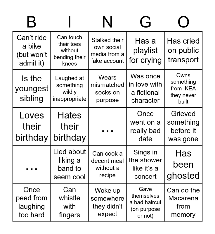 This bingo card has a free space and 133 words: ..., ..., ..., ..., ..., ..., ..., ..., ..., Has lived in another country, Can name all the Harry Potter books in order, Owns more than 3 plants, Has cried during a Disney movie, Has once forgotten their own birthday, Is afraid of birds, Speaks 3 or more languages, Once dyed their hair a bold color, Knows how to knit or crochet, Has attended a wedding this year, Has never broken a bone, Used to have a Tumblr account, Can whistle with fingers, Can do the Macarena from memory, Has fallen asleep during a lecture, Has had a broken heart, Has experienced a major loss, Wears mismatched socks on purpose, Has adopted a pet, Once wrote a poem about someone, Can name 5 Taylor Swift songs, Was once in love with a fictional character, Can touch their toes without bending their knees, Has been ghosted, Owns something from IKEA they never built, Once sent a risky text, Has felt homesick in the last year, Once laughed at a funeral (nervously counts), Has been in therapy, Has danced alone in the rain, Once kissed someone they shouldn't have, Has a playlist for crying, Can name 3 kinds of cheese, Has had a weird roommate, Has binged a whole series in one weekend, Secretly likes pineapple on pizza, Once fell in public and pretended it didn’t happen, Still sleeps with a stuffed animal, Knows the entire script of a movie by heart, Once went on a really bad date, Has cried on public transport, Thinks about death more often than they’d admit, Has written a letter they never sent, Regrets something they never said, Has been someone’s emergency contact, Has felt completely alone in a crowd, Once gave really bad advice, Lied and said they were "fine", Had a panic attack in a weird place, Stayed friends with an ex (or tried to), Hates their birthday, Loves their birthday, Finds comfort in routines, Misses someone they haven’t spoken to in years, Cares more than they show, Often comforts others but forgets themselves, Once left a party to cry in the bathroom, Would drop everything for a friend in need, Has trouble asking for help, Is the oldest sibling, Is the youngest sibling, Is an only child, Can cook a decent meal without a recipe, Owns a ridiculous mug, Wrote cringey fanfiction as a teen, Has read a book that changed their life, Misses someone they lost, Still talks to someone who passed away, Found strength they didn’t know they had, Held someone's hand through grief, Lost someone suddenly, Felt guilty after someone’s death, Had to be strong for others, Wrote a goodbye they never got to say, Grieved something before it was gone, Worries about forgetting someone, Keeps something that belonged to someone they lost, Still checks a loved one’s old social media, Heard someone's last words, Cried over a pet that died years ago, Said "I’m fine" when they were breaking inside, Laughed at something wildly inappropriate, Once dated someone with a weird name, Got dumped over text, Still checks an ex’s Instagram, Woke up somewhere they didn’t expect, Fell asleep during an important moment, Pretended to know what someone was talking about, Thought their mic was off (but it wasn’t), Started crying while watching a cooking video, Had an imaginary friend for too long, Tried to impress someone and failed, Lied about liking a band to seem cool, Stalked their own social media from a fake account, Got a weird injury from something very normal, Once made up a fake hobby for a dating profile, Had to Google what someone meant in a conversation, Forgot someone’s name mid-conversation, Blurted something out and immediately regretted it, Saved a weird voicemail just because, Once practiced crying in the mirror, Told someone they were okay just to avoid talking, Once peed from laughing too hard, Can make a weird noise with their body, Gave themselves a bad haircut (on purpose or not), Has cried at a party, Laughed so hard they started crying, Once danced and regretted it the next day, Can’t ride a bike (but won’t admit it), Has had an existential crisis over a potato, Sings in the shower like it’s a concert, Once had a dream so intense it changed their mood for the whole day, Still holds a grudge from 10 years ago, Owns a shirt with a stain but wears it anyway, Had a spiritual crisis in IKEA, Lost sleep over an imaginary argument, Got mad at someone in a dream and stayed mad in real life, Talked to themselves in public (and pretended it was Bluetooth), Used “I have a stomach ache” as an excuse for emotional distress, Thinks too much while brushing their teeth, Had an emotion they couldn’t name, Once fake-laughed for an hour straight, Felt emotionally attached to a song they didn’t understand and Started crying and didn’t know why.