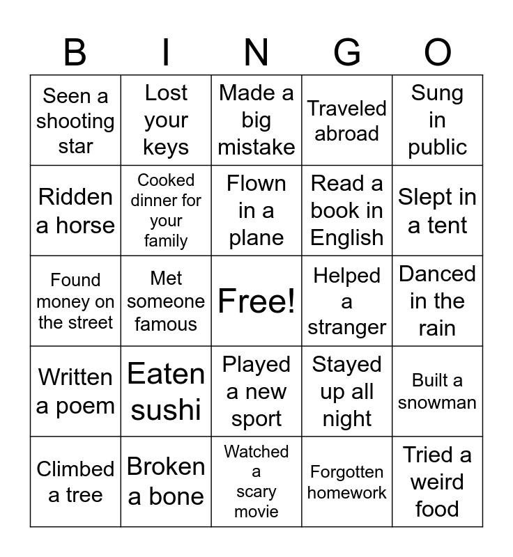 This bingo card has a free space and 24 words: Eaten sushi, Broken a bone, Flown in a plane, Climbed a tree, Sung in public, Seen a shooting star, Ridden a horse, Lost your keys, Helped a stranger, Played a new sport, Read a book in English, Found money on the street, Stayed up all night, Built a snowman, Cooked dinner for your family, Forgotten homework, Danced in the rain, Made a big mistake, Slept in a tent, Met someone famous, Tried a weird food, Written a poem, Traveled abroad and Watched a scary movie.