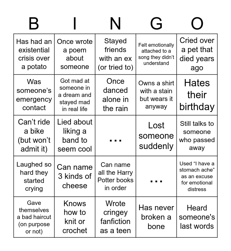 This bingo card has a free space and 154 words: ..., ..., ..., ..., ..., ..., ..., ..., ..., Had an emotion they couldn’t name, Once peed from laughing too hard, Has cried at a party, Owns a shirt with a stain but wears it anyway, Has had a weird roommate, Still talks to someone who passed away, Cried over a pet that died years ago, Woke up somewhere they didn’t expect, Can name all the Harry Potter books in order, Still checks a loved one’s old social media, Once sent a risky text, Has been in therapy, Owns more than 3 plants, Once gave really bad advice, Misses someone they haven’t spoken to in years, Had a panic attack in a weird place, Can cook a decent meal without a recipe, Has never broken a bone, Laughed so hard they started crying, Regrets something they never said, Started crying while watching a cooking video, Is an only child, Once practiced crying in the mirror, Once dyed their hair a bold color, Had a spiritual crisis in IKEA, Has cried during a Disney movie, Can make a weird noise with their body, Has a playlist for crying, Has experienced a major loss, Got dumped over text, Pretended to know what someone was talking about, Was once in love with a fictional character, Still holds a grudge from 10 years ago, Lost someone suddenly, Started crying and didn’t know why, Can do the Macarena from memory, Lost sleep over an imaginary argument, Cares more than they show, Knows the entire script of a movie by heart, Is afraid of birds, Once danced and regretted it the next day, Can whistle with fingers, Hates their birthday, Has fallen asleep during a lecture, Is the youngest sibling, Thinks too much while brushing their teeth, Found strength they didn’t know they had, Wears mismatched socks on purpose, Speaks 3 or more languages, Owns a ridiculous mug, Has a playlist for crying, Once wrote a poem about someone, Has a shirt with a stain but wears it anyway, Woke up somewhere they didn’t expect, Once blurted something and instantly regretted it, Once had a dream so intense it changed their mood for the whole day, Has binged a whole series in one weekend, Can name 3 kinds of cheese, Has written a letter they never sent, Saved a weird voicemail just because, Once went on a really bad date, Can touch their toes without bending their knees, Had to be strong for others, Knows how to knit or crochet, Said "I’m fine" when they were breaking inside, Grieved something before it was gone, Lied and said they were "fine", Laughed at something wildly inappropriate, Can name 5 Taylor Swift songs, Talked to themselves in public (and pretended it was Bluetooth), Was once in love with a fictional character, Has written a letter they never sent, Heard someone's last words, Misses someone they lost, Once made up a fake hobby for a dating profile, Lied about liking a band to seem cool, Got mad at someone in a dream and stayed mad in real life, Is the oldest sibling, Can sing in the shower like it’s a concert, Has a playlist for crying, Gave themselves a bad haircut (on purpose or not), Has had an existential crisis over a potato, Used to have a Tumblr account, Kept something that belonged to someone they lost, Got a weird injury from something very normal, Can’t ride a bike (but won’t admit it), Once left a party to cry in the bathroom, Had to Google what someone meant in a conversation, Stalked their own social media from a fake account, Has cried on public transport, Thinks about death more often than they’d admit, Can name all the Harry Potter books in order, Once kissed someone they shouldn't have, Was someone’s emergency contact, Can whistle with fingers, Has attended a wedding this year, Has felt homesick in the last year, Can do the Macarena from memory, Felt guilty after someone’s death, Can ride a bike (but badly), Is afraid of birds, Is the youngest sibling, Once danced alone in the rain, Wears mismatched socks on purpose, Stayed friends with an ex (or tried to), Can sing in the shower like it’s a concert, Knows how to knit or crochet, Once laughed at a funeral (nervously counts), Wrote cringey fanfiction as a teen, Loves their birthday, Can name all the Harry Potter books in order, Had an imaginary friend for too long, Talked to themselves in public (and pretended it was Bluetooth), Was once in love with a fictional character, Got dumped over text, Owns something from IKEA they never built, Has been ghosted, Once made up a fake hobby for a dating profile, Once kissed someone they shouldn't have, Once fell in public and pretended it didn’t happen, Once peed from laughing too hard, Pretended to know what someone was talking about, Felt emotionally attached to a song they didn’t understand, Started crying while watching a cooking video, Saved a weird voicemail just because, Once gave really bad advice, Once had a dream so intense it changed their mood for the whole day, Has written a letter they never sent, Has experienced a major loss, Once dated someone with a weird name, Used “I have a stomach ache” as an excuse for emotional distress, Has a playlist for crying, Knows how to knit or crochet, Has read a book that changed their life, Had a spiritual crisis in IKEA, Fell asleep during an important moment, Has cried during a Disney movie, Tried to impress someone and failed, Has cried at a party, Misses someone they haven’t spoken to in years, Had a panic attack in a weird place, Talked to themselves in public (and pretended it was Bluetooth), Cried over a pet that died years ago, Grieved something before it was gone and Wrote a goodbye they never got to say.