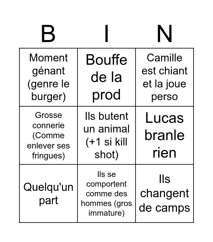 This bingo card has a free space and 8 words: Lucas branle rien, Camille est chiant et la joue perso, Bouffe de la prod, Quelqu'un part, Moment génant (genre le burger), Ils changent de camps, Grosse connerie (Comme enlever ses fringues) and Ils se comportent comme des hommes (gros immature).