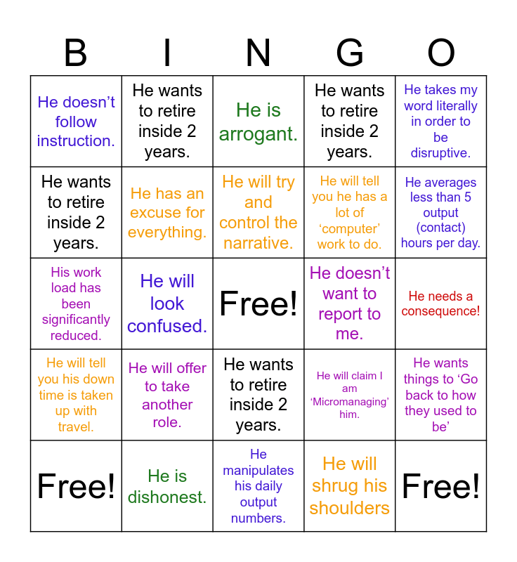 This bingo card has a free space and 29 words: He wants to retire inside 2 years., He is dishonest., He is arrogant., He thinks he’s untouchable., He takes my word literally in order to be disruptive., He doesn’t follow instruction., He has an excuse for everything., He will try and control the narrative., He doesn’t want to report to me., He wants things to ‘Go back to how they used to be’, Free!, He will look confused., He will shrug his shoulders, Free!, His work load has been significantly reduced., He will tell you he is very busy., He manipulates his daily output numbers., He will claim I am ‘Micromanaging’ him., He averages less than 5 output (contact) hours per day., He will tell you his down time is taken up with travel., He will offer to take another role., Most days he has minimal travel., He will tell you he has a lot of ‘computer’ work to do., He needs a consequence!, He wants to retire inside 2 years., He wants to retire inside 2 years., He wants to retire inside 2 years., He wants to retire inside 2 years. and He wants to retire inside 2 years..