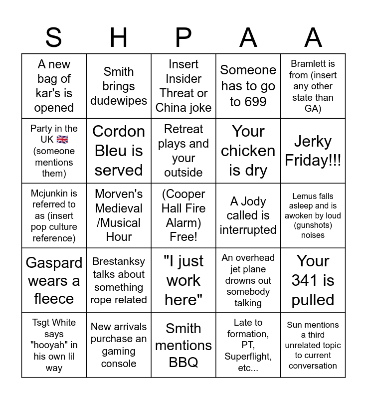 This bingo card has a free space and 24 words: Brestanksy talks about something rope related, New arrivals purchase an gaming console, Retreat plays and your outside, Tsgt White says "hooyah" in his own lil way, Bramlett is from (insert any other state than GA), A new bag of kar's is opened, Party in the UK 🇬🇧(someone mentions them), Smith brings dudewipes, A Jody called is interrupted, "I just work here", Your chicken is dry, Mcjunkin is referred to as (insert pop culture reference), An overhead jet plane drowns out somebody talking, Your 341 is pulled, Cordon Bleu is served, Late to formation, PT, Superflight, etc..., Lemus falls asleep and is awoken by loud (gunshots) noises, Insert Insider Threat or China joke, Jerky Friday!!!, Morven's Medieval /Musical Hour, Sun mentions a third unrelated topic to current conversation, Gaspard wears a fleece, Someone has to go to 699 and Smith mentions BBQ.