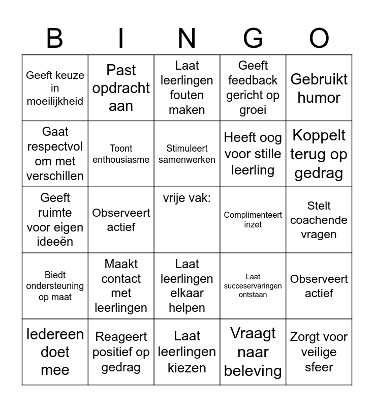 This bingo card has a free space and 24 words: Iedereen doet mee, Maakt contact met leerlingen, Stimuleert samenwerken, Vraagt naar beleving, Gebruikt humor, Geeft keuze in moeilijkheid, Past opdracht aan, Laat leerlingen fouten maken, Complimenteert inzet, Stelt coachende vragen, Geeft ruimte voor eigen ideeën, Toont enthousiasme, Laat succeservaringen ontstaan, Observeert actief, Gaat respectvol om met verschillen, Reageert positief op gedrag, Laat leerlingen kiezen, Geeft feedback gericht op groei, Koppelt terug op gedrag, Biedt ondersteuning op maat, Observeert actief, Laat leerlingen elkaar helpen, Heeft oog voor stille leerling and Zorgt voor veilige sfeer.