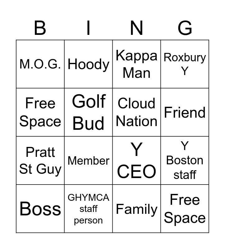 This bingo card has 16 words: GHYMCA staff person, Y Boston staff, Kappa Man, M.O.G., Pratt St Guy, Hoody, Y CEO, Family, Free Space, Golf Bud, Boss, Roxbury Y, Member, Friend, Cloud Nation and Free Space.