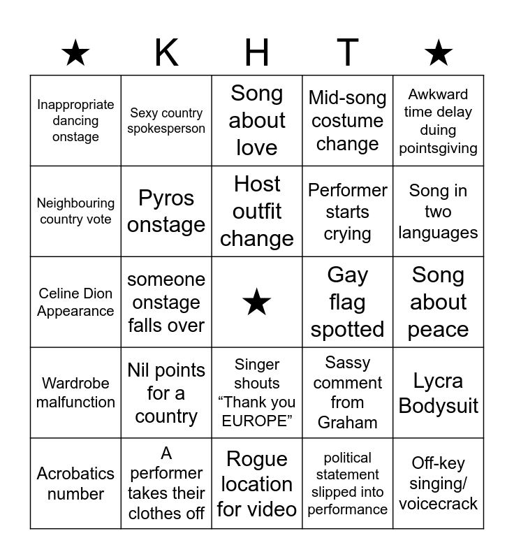 This bingo card has a free space and 24 words: Nil points for a country, A performer takes their clothes off, Host outfit change, Acrobatics number, Awkward time delay duing pointsgiving, Inappropriate dancing onstage, Neighbouring country vote, Sexy country spokesperson, Gay flag spotted, Singer shouts “Thank you EUROPE”, Performer starts crying, Celine Dion Appearance, Sassy comment from Graham, Lycra Bodysuit, Pyros onstage, political statement slipped into performance, Song about peace, Song about love, Song in two languages, someone onstage falls over, Off-key singing/ voicecrack, Wardrobe malfunction, Mid-song costume change and Rogue location for video.
