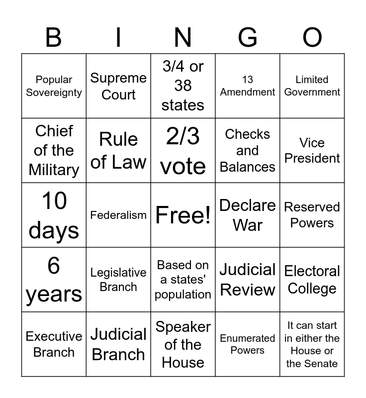 This bingo card has a free space and 24 words: Legislative Branch, Judicial Branch, 2/3 vote, Executive Branch, Limited Government, Popular Sovereignty, Chief of the Military, Supreme Court, Declare War, Based on a states' population, Checks and Balances, 10 days, Judicial Review, Electoral College, Rule of Law, Enumerated Powers, Reserved Powers, 3/4 or 38 states, Vice President, Federalism, It can start in either the House or the Senate, 6 years, 13 Amendment and Speaker of the House.