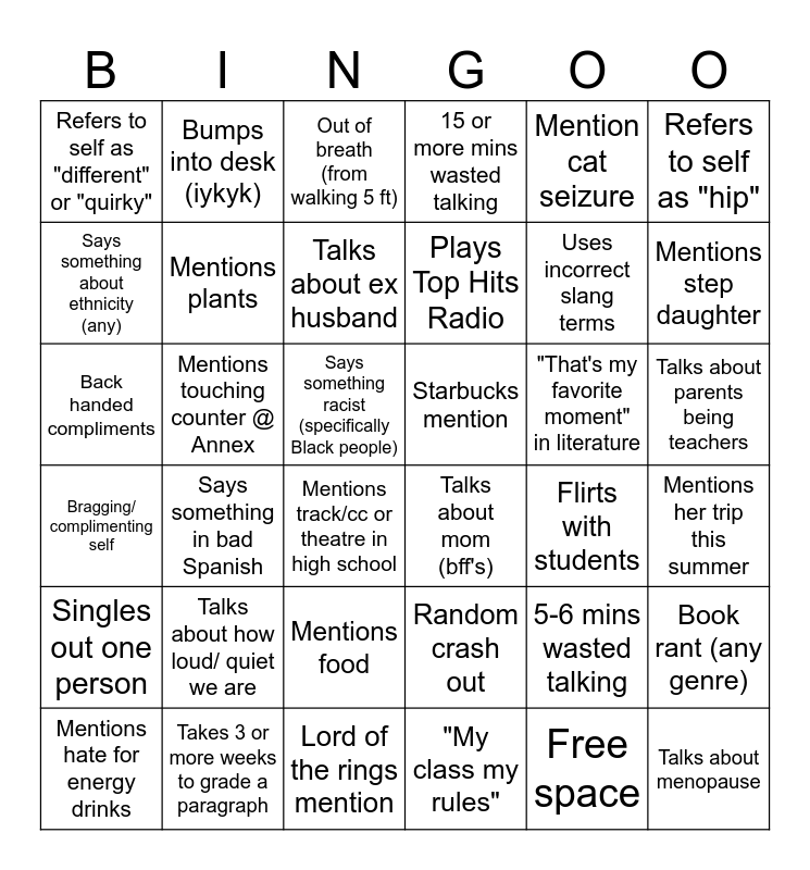 This bingo card has 36 words: Random crash out, Mentions food, "My class my rules", Says something about ethnicity (any), Bragging/ complimenting self, Starbucks mention, Mentions plants, Lord of the rings mention, Mention cat seizure, 5-6 mins wasted talking, Mentions step daughter, 15 or more mins wasted talking, Book rant (any genre), Mentions touching counter @ Annex, Plays Top Hits Radio, Refers to self as "different" or "quirky", Singles out one person, "That's my favorite moment" in literature, Back handed compliments, Out of breath (from walking 5 ft), Says something racist (specifically Black people), Says something in bad Spanish, Talks about mom (bff's), Mentions track/cc or theatre in high school, Flirts with students, Bumps into desk (iykyk), Uses incorrect slang terms, Takes 3 or more weeks to grade a paragraph, Talks about ex husband, Refers to self as "hip", Talks about menopause, Mentions hate for energy drinks, Mentions her trip this summer, Talks about parents being teachers, Talks about how loud/ quiet we are and Free space.