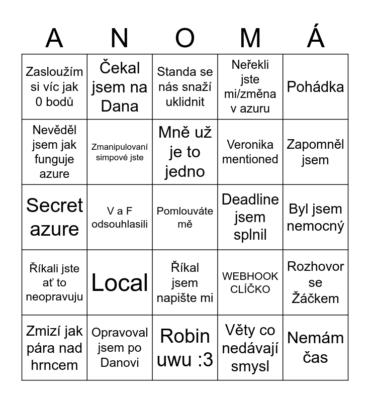 This bingo card has a free space and 24 words: Local, Opravoval jsem po Danovi, Mně už je to jedno, Zmizí jak pára nad hrncem, Pohádka, Zasloužím si víc jak 0 bodů, Nevěděl jsem jak funguje azure, Čekal jsem na Dana, Deadline jsem splnil, Říkal jsem napište mi, Veronika mentioned, Secret azure, WEBHOOK CLÍČKO, Rozhovor se Žáčkem, Zmanipulovaní simpové jste, Věty co nedávají smysl, Byl jsem nemocný, Standa se nás snaží uklidnit, Zapomněl jsem, V a F odsouhlasili, Nemám čas, Říkali jste ať to neopravuju, Neřekli jste mi/změna v azuru and Robin uwu :3.