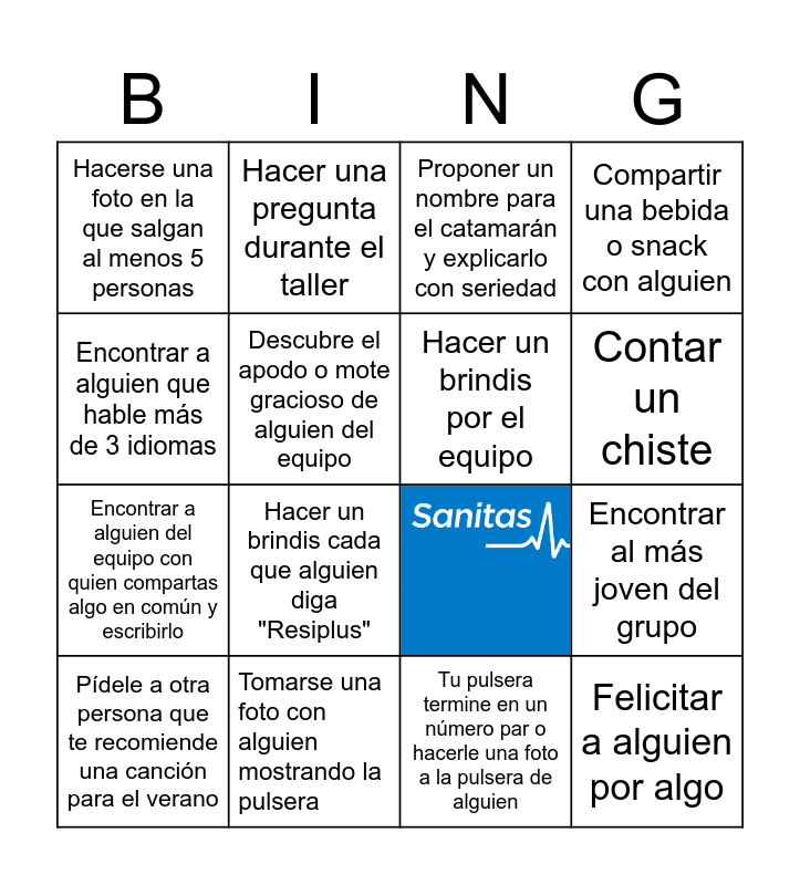 This bingo card has 1 images and 20 words: Tomarse una foto con alguien mostrando la pulsera, Contar una anecdota graciosa, Hacer una pregunta durante el taller, Tomarte una selfie con el mar de fondo, Tu pulsera termine en un número par o hacerle una foto a la pulsera de alguien, Hacer un brindis por el equipo, Hacerse una foto en la que salgan al menos 5 personas, Proponer un nombre para el catamarán y explicarlo con seriedad, Contar un chiste, Encontrar a alguien del equipo con quien compartas algo en común y escribirlo, Compartir una bebida o snack con alguien, Felicitar a alguien por algo, Pregunta a alguien qué es lo que más le gusta de su trabajo, Descubre el apodo o mote gracioso de alguien del equipo, Pregunta a alguien qué fue lo mejor de su semana, Pídele a otra persona que te recomiende una canción para el verano, Hacer un brindis cada que alguien diga "Resiplus", Encontrar a alguien que hable más de 3 idiomas, Encontrar al más joven del grupo and Encontrar a alguien que haya trabajado en otra BU antes que Mayores.
