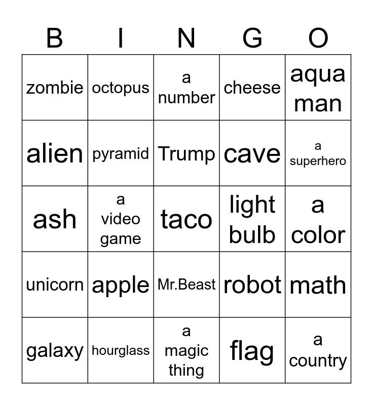 This bingo card has a free space and 24 words: apple, hourglass, Trump, galaxy, aqua man, zombie, alien, octopus, light bulb, Mr.Beast, cave, ash, robot, math, pyramid, flag, a color, a number, a superhero, a video game, a country, unicorn, cheese and a magic thing.