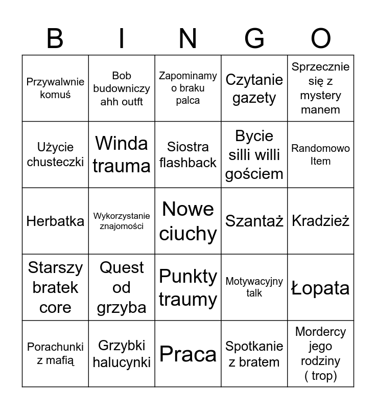 This bingo card has a free space and 24 words: Quest od grzyba, Grzybki halucynki, Siostra flashback, Porachunki z mafią, Sprzecznie się z mystery manem, Przywalwnie komuś, Użycie chusteczki, Bob budowniczy ahh outft, Szantaż, Punkty traumy, Bycie silli willi gościem, Herbatka, Motywacyjny talk, Łopata, Winda trauma, Spotkanie z bratem, Kradzież, Zapominamy o braku palca, Randomowo Item, Wykorzystanie znajomości, Mordercy jego rodziny ( trop), Starszy bratek core, Czytanie gazety and Praca.
