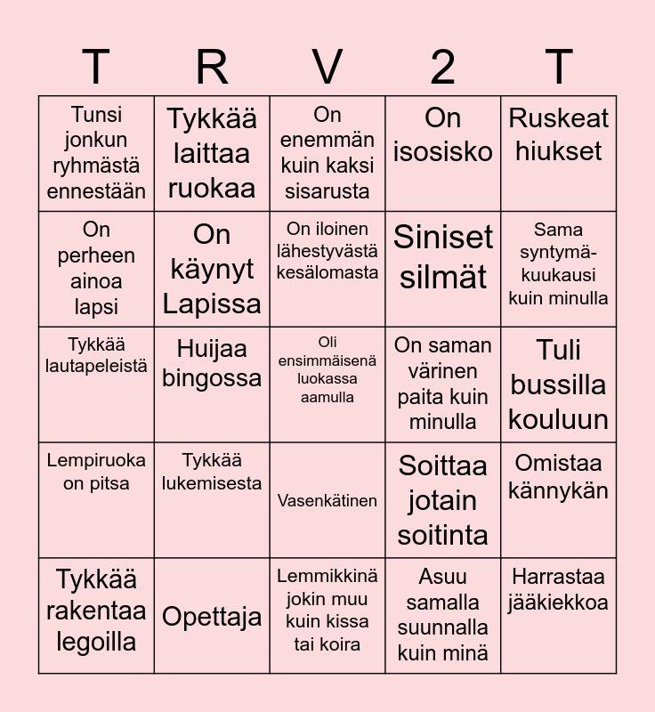This bingo card has 25 words: Tykkää lukemisesta, Lemmikkinä jokin muu kuin kissa tai koira, On iloinen lähestyvästä kesälomasta, Tykkää rakentaa legoilla, Ruskeat hiukset, Tunsi jonkun ryhmästä ennestään, On perheen ainoa lapsi, Tykkää laittaa ruokaa, On saman värinen paita kuin minulla, Vasenkätinen, Siniset silmät, Tykkää lautapeleistä, Soittaa jotain soitinta, Omistaa kännykän, On käynyt Lapissa, Harrastaa jääkiekkoa, Tuli bussilla kouluun, On enemmän kuin kaksi sisarusta, Sama syntymä- kuukausi kuin minulla, Huijaa bingossa, Oli ensimmäisenä luokassa aamulla, Opettaja, Lempiruoka on pitsa, On isosisko and Asuu samalla suunnalla kuin minä.
