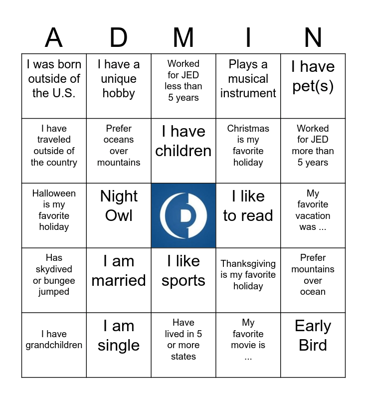 This bingo card has a free space and 24 words: I am married, I am single, I have children, I have grandchildren, I have pet(s), I was born outside of the U.S., I have traveled outside of the country, I have a unique hobby, I like to read, I like sports, Christmas is my favorite holiday, Halloween is my favorite holiday, Thanksgiving is my favorite holiday, Prefer mountains over ocean, Prefer oceans over mountains, My favorite movie is ..., My favorite vacation was ..., Worked for JED less than 5 years, Worked for JED more than 5 years, Night Owl, Early Bird, Has skydived or bungee jumped, Plays a musical instrument and Have lived in 5 or more states.